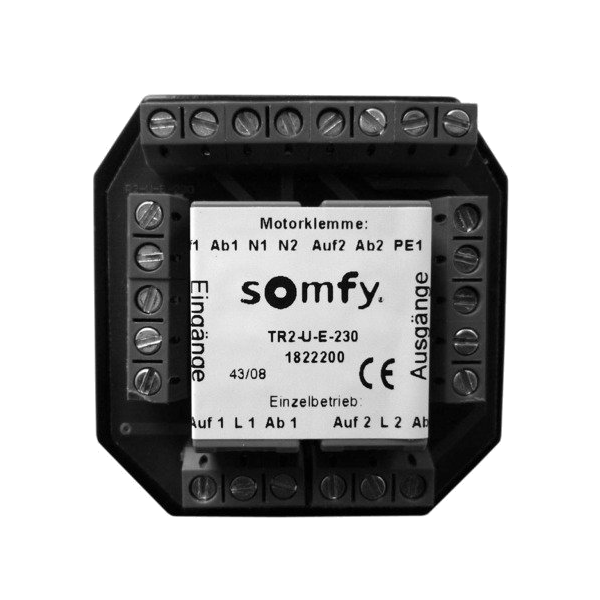• Somfy 1822200 TR2-U-E-230 przekaźnik separujący. przekaźnik do grupowego sterowania napędami do rolet i żaluzji z mechanicznymi lub elektronicznymi wyłącznikami krańcowymi. Jest używany do równoległego połączenia napędów rolet lub żaluzji.