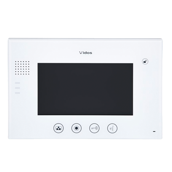 M670W - kolorowy monitor głośnomówiący z 7" ekranem LCD. Obsługuje dwa wejścia lub 1 wejście i 1 kamerę CCTV. Funkcja interkomu pozwala na komunikację głosową między urządzeniami wewnętrznymi. Zasilanie 14,5 V DC. Wymiary: 241 x 161 x 23mm. Współpracuje ze wszystkimi stacjami bramowymi Vidos.