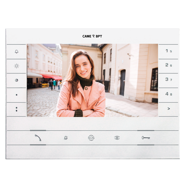 Wideodomofon głośnomówiący z wyświetlaczem LCD 7'', przyciski „soft touch“, w kolorze białym. Monitor ścienny z wyświetlaczem LCD 7''. Po lewej stronie znajdują się przyciski do regulacji/wyłączenia dzwonka, regulacji kontrastu i jasności i 2 przyciski dodatkowe, natomiast po stronie prawej znajdują się przyciski, które umożliwiają wykonanie do 8 wywołań interkomowych. U dołu znajduje się 5 dobrze widocznych przycisków obsługujących podstawowe funkcje: uruchomienie komunikacji, wyłączenie dzwonka, przycisk „Panika“ do wezwania pomocy portiera, samouruchomienie obrazu z paneli wejściowych i przycisk otwierania drzwi. Jest wyposażony w funkcję master/slave i funkcję zmiany obrazu pomiędzy panelami wewnętrznymi podczas jednoczesnego wywołania. Dołączony wspornik do montażu w obudowie natynkowej 503 (poziomej lub pionowej) i w obudowie okrągłej Ø 60 mm. Kompatybilny z systemem X1 i XIP.