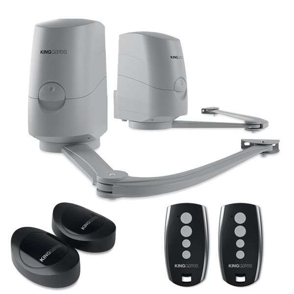 - King Gates MODUS zestaw automatyki z ramieniem łamanym do bram dwuskrzydłowych o długości skrzydła do 2,8m i ciężarze do 300kg. Przeznaczone do montażu na bardzo szerokich słupkach, nawet do 35 cm głębokości osadzenia zawiasu.