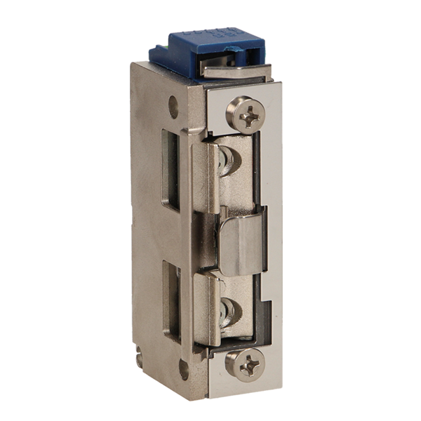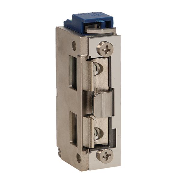 Elektrozaczep symetryczny, małogabarytowy wyposażony w dodatkową funkcję pamięci, która pozwala na sterowanie elektrozaczepem przez podanie krótkiego impulsu napięciowego. Po ustaniu impulsu stan otwarcia zaczepu podtrzymywany jest mechanicznie, aż do momentu otwarcia drzwi. Po zamknięciu drzwi zaczep samoczynnie się blokuje.