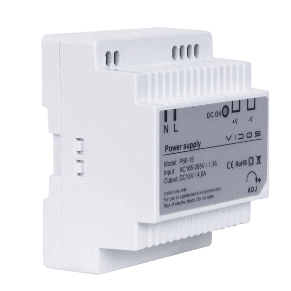 • Vidos P60/15 zasilacz do wideodomofonu. Zasilacz do systemów wideodomofonowych Vidos przystosowany do montażu na szynę DIN.