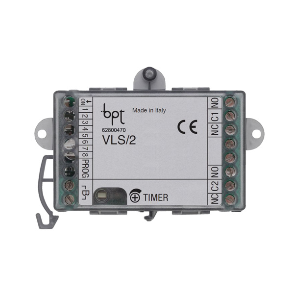 Moduł przekaźnikowy VLS/2 do domofonów i wideofonów CAME. Moduł zawiera dwa przekaźniki uruchamiane w trybie chwilowym lub z programowanym timerem. Moduł sterowany jest z panelu domowego z przycisków oznaczonych jako pojedyncza i podwójna kropka (AUX1 i AUX2). Ogromną zaletą jest brak konieczności doprowadzenia zasilania zewnętrznego – w przypadku oferowanego tutaj modułu komunikacja i zasilanie odbywa się wyłącznie poprzez szynę BUS co skraca czas montażu i zmniejsza ilość potrzebnych przewodów. Moduł stosowany jest do sterowania urządzeniami dodatkowymi np. otwieranie bramy wjazdowej z wideomonitora, zapalanie światła na podjeździe itp.