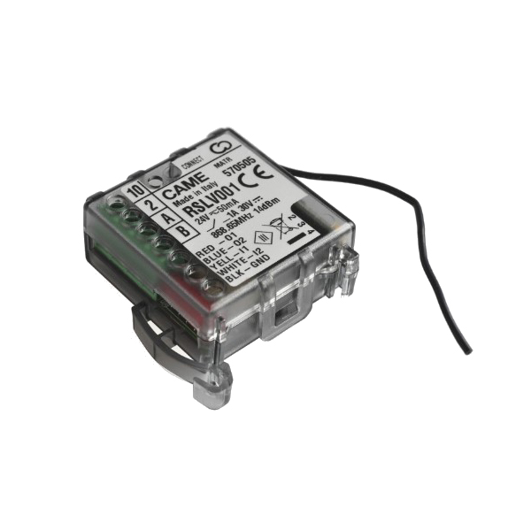 - Came 806SA-0040 RSLV001 radiowy moduł wykonawczy SLAVE. Posiada 2 wejścia, 2 wyjścia przekaźnikowe oraz wyjście protokołu CRP. Może współpracować z dowolnym urządzeniem sterowanym zestykiem typu N.O. Zasilanie 12-30 V A.C./D.C.